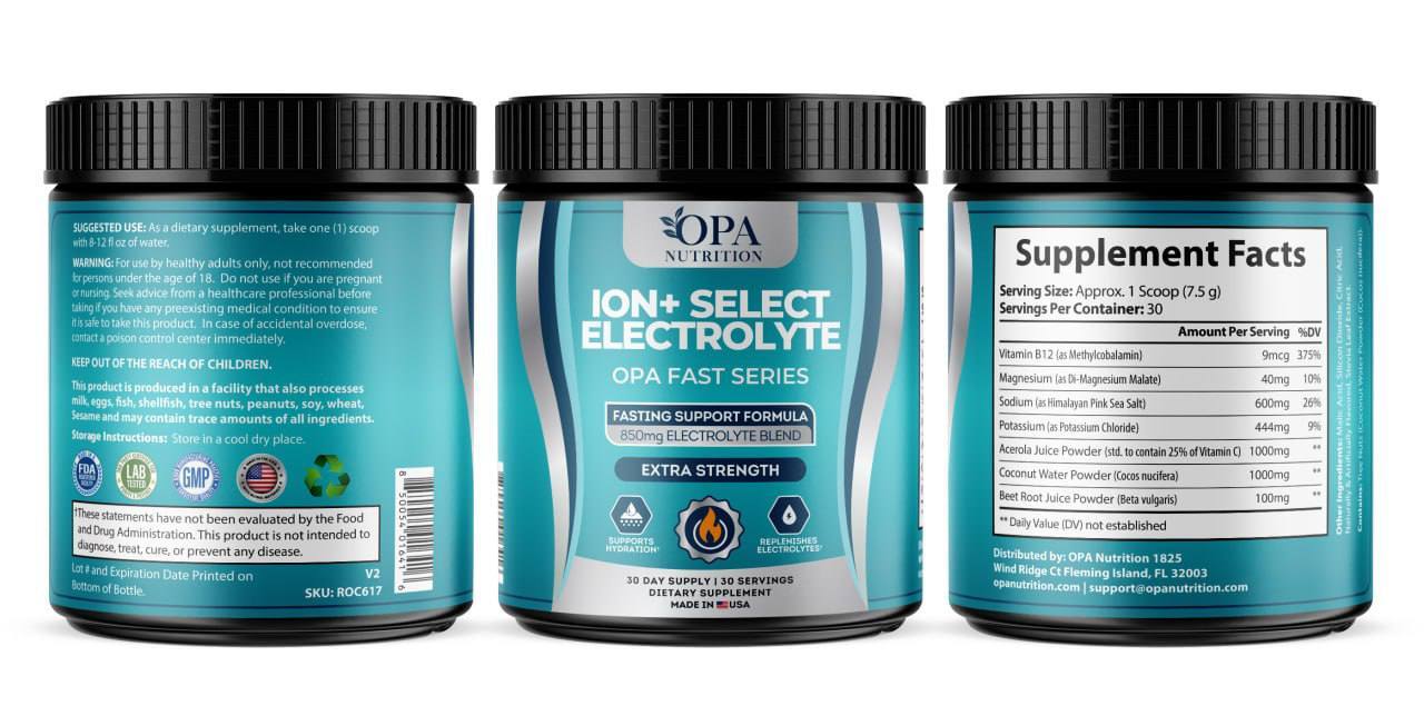 OPA FAST Series ION Plus Select Electrolyte Powder is formulated to support clean, consistent hydration habits, especially for those following intermittent fasting routines. This easy-to-mix powder includes a blend of Magnesium, Potassium Chloride, Coconut Water, and Himalayan Pink Salt to help you stay refreshed throughout the day.