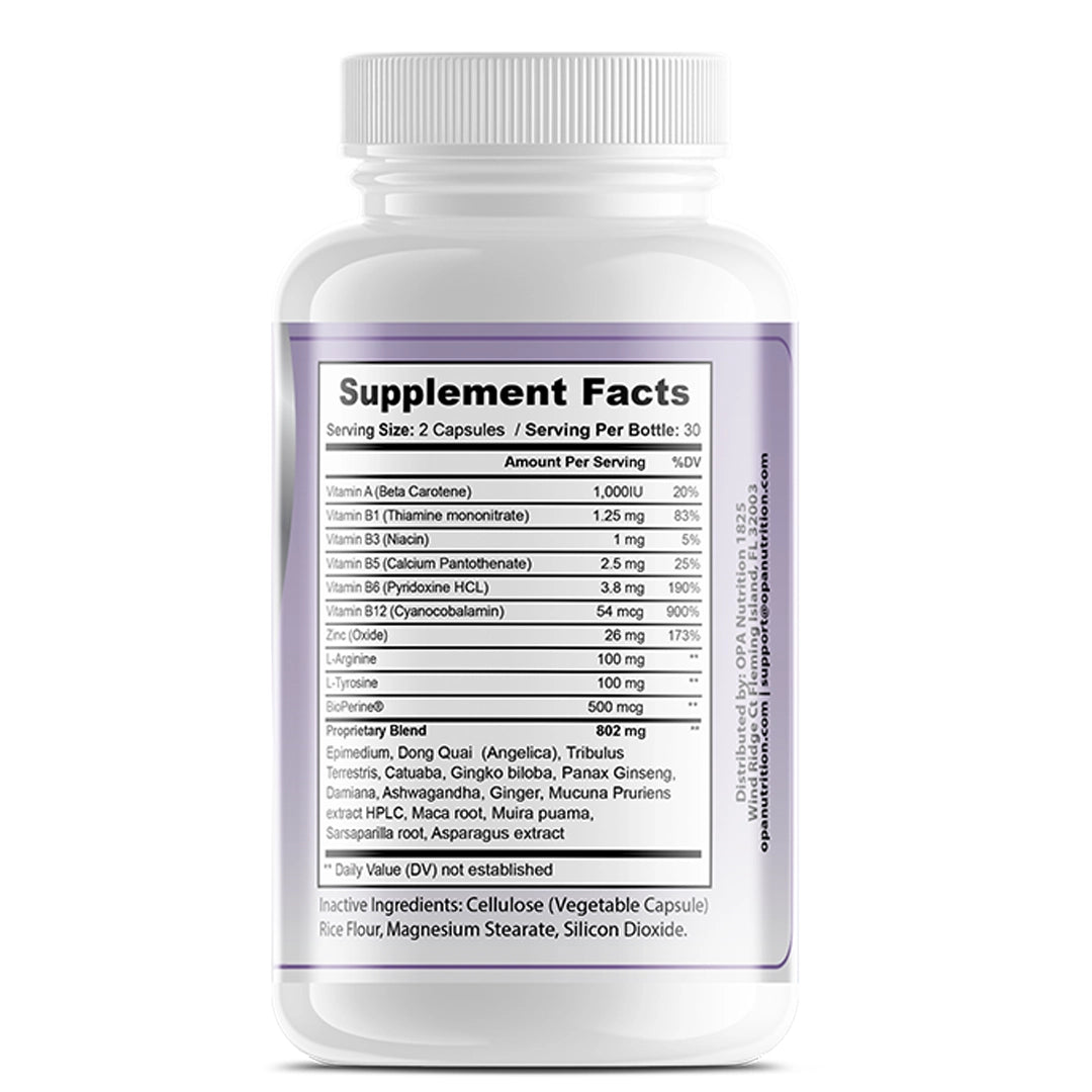 Each serving provides a range of B vitamins along with vitamin A, zinc, L-arginine, and L-tyrosine. The proprietary herbal blend features epimedium, dong quai, tribulus terrestris, ginkgo biloba, maca root, and ashwagandha for well-rounded daily support. Encapsulated in vegetable capsules, this formula is designed for consistency—just two capsules per serving. With 60 capsules per bottle (30 servings), it provides a convenient month of daily support.